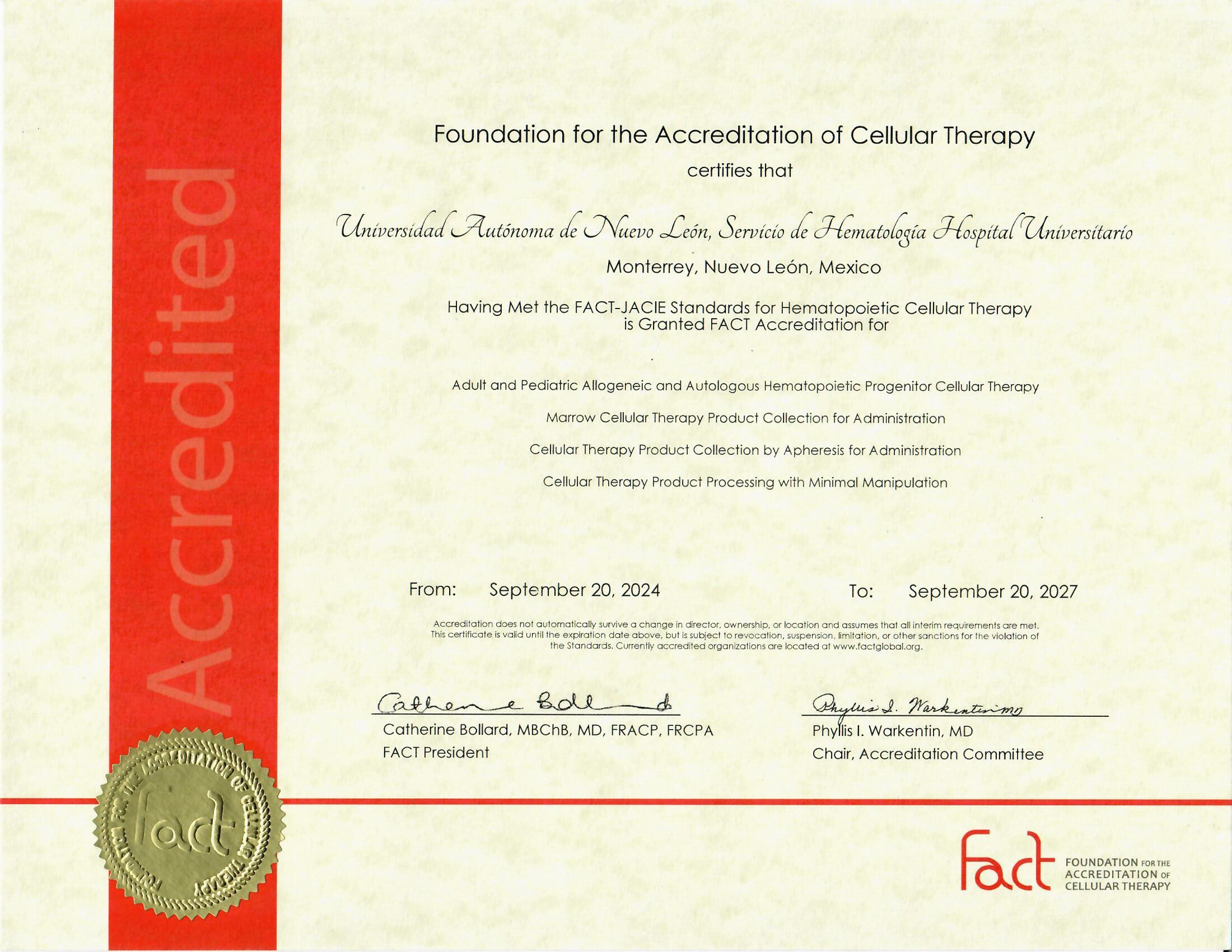 El 𝐒𝐞𝐫𝐯𝐢𝐜𝐢𝐨 𝐝𝐞 𝐇𝐞𝐦𝐚𝐭𝐨𝐥𝐨𝐠𝐢́𝐚 𝐝𝐞𝐥 𝐇𝐨𝐬𝐩𝐢𝐭𝐚𝐥 𝐔𝐧𝐢𝐯𝐞𝐫𝐬𝐢𝐭𝐚𝐫𝐢𝐨 𝐝𝐞 𝐥𝐚 𝐔𝐧𝐢𝐯𝐞𝐫𝐬𝐢𝐝𝐚𝐝 𝐀𝐮𝐭𝐨́𝐧𝐨𝐦𝐚 𝐝𝐞 𝐍𝐮𝐞𝐯𝐨 𝐋𝐞𝐨́𝐧 (𝐔𝐀𝐍𝐋) ha mantenido su 𝐚𝐜𝐫𝐞𝐝𝐢𝐭𝐚𝐜𝐢𝐨́𝐧 desde el 2016 por la 𝐅𝐨𝐮𝐧𝐝𝐚𝐭𝐢𝐨𝐧 𝐟𝐨𝐫 𝐭𝐡𝐞 𝐀𝐜𝐜𝐫𝐞𝐝𝐢𝐭𝐚𝐭𝐢𝐨𝐧 𝐨𝐟 𝐂𝐞𝐥𝐥𝐮𝐥𝐚𝐫 𝐓𝐡𝐞𝐫𝐚𝐩𝐲 (𝐅𝐀𝐂𝐓) bajo los estándares internacionales FACT-JACIE.